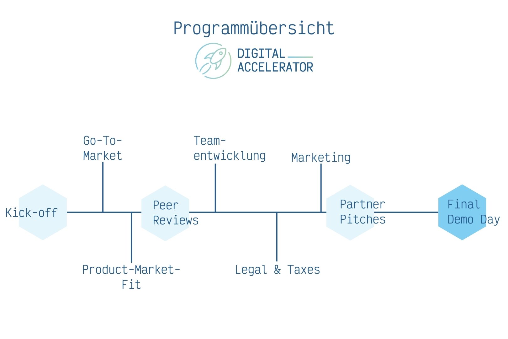 Dann ist unser digitalACCELERATOR genau das richtige für euch! In unserem zehnmonatigen digitalACCELERATOR-Programm unterstützen wir euch individuell beim nachhaltigen Wachstum eures Startups.